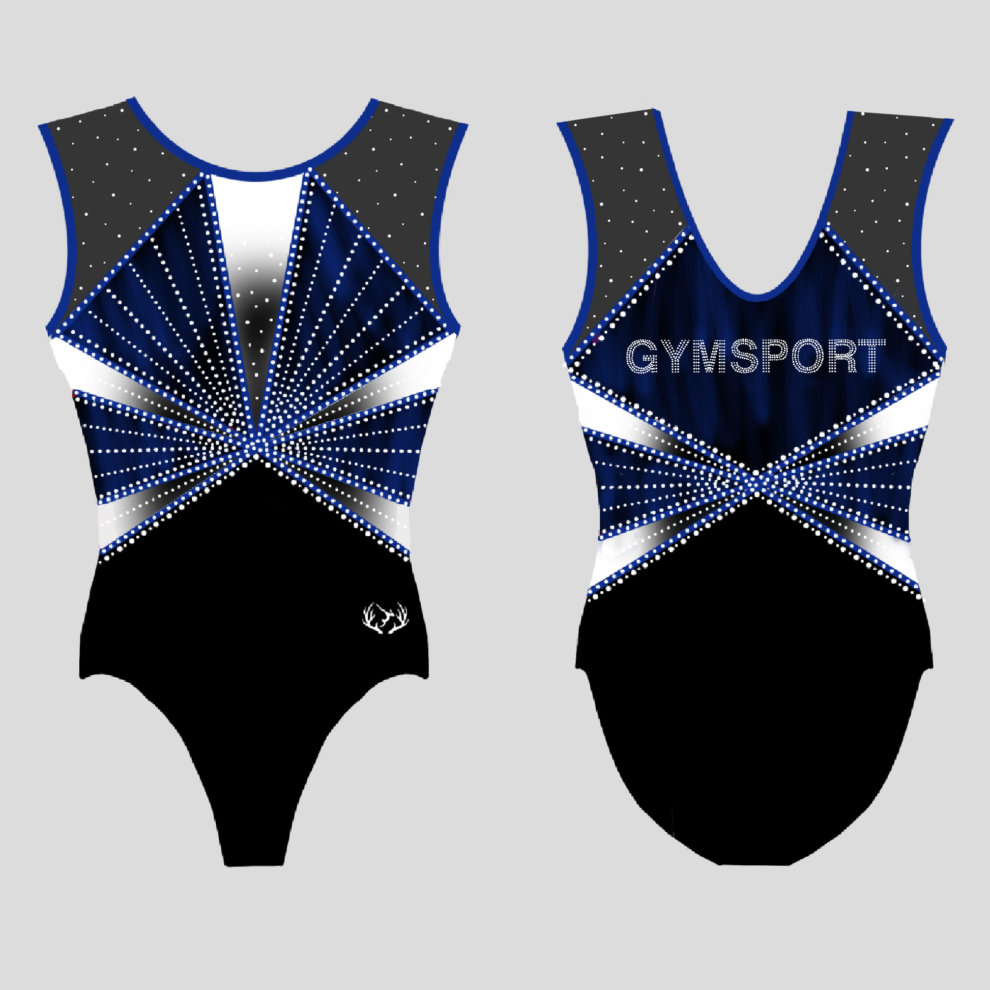 The leotard features a black mystique bottom bodice, with the upper bodice featuring deep royal blue mystique paired with black mesh and ombréd Lycra. Hundreds of clear diamantés embellish the leotard, with 'GYMSPORT' diamanté letters across the back.