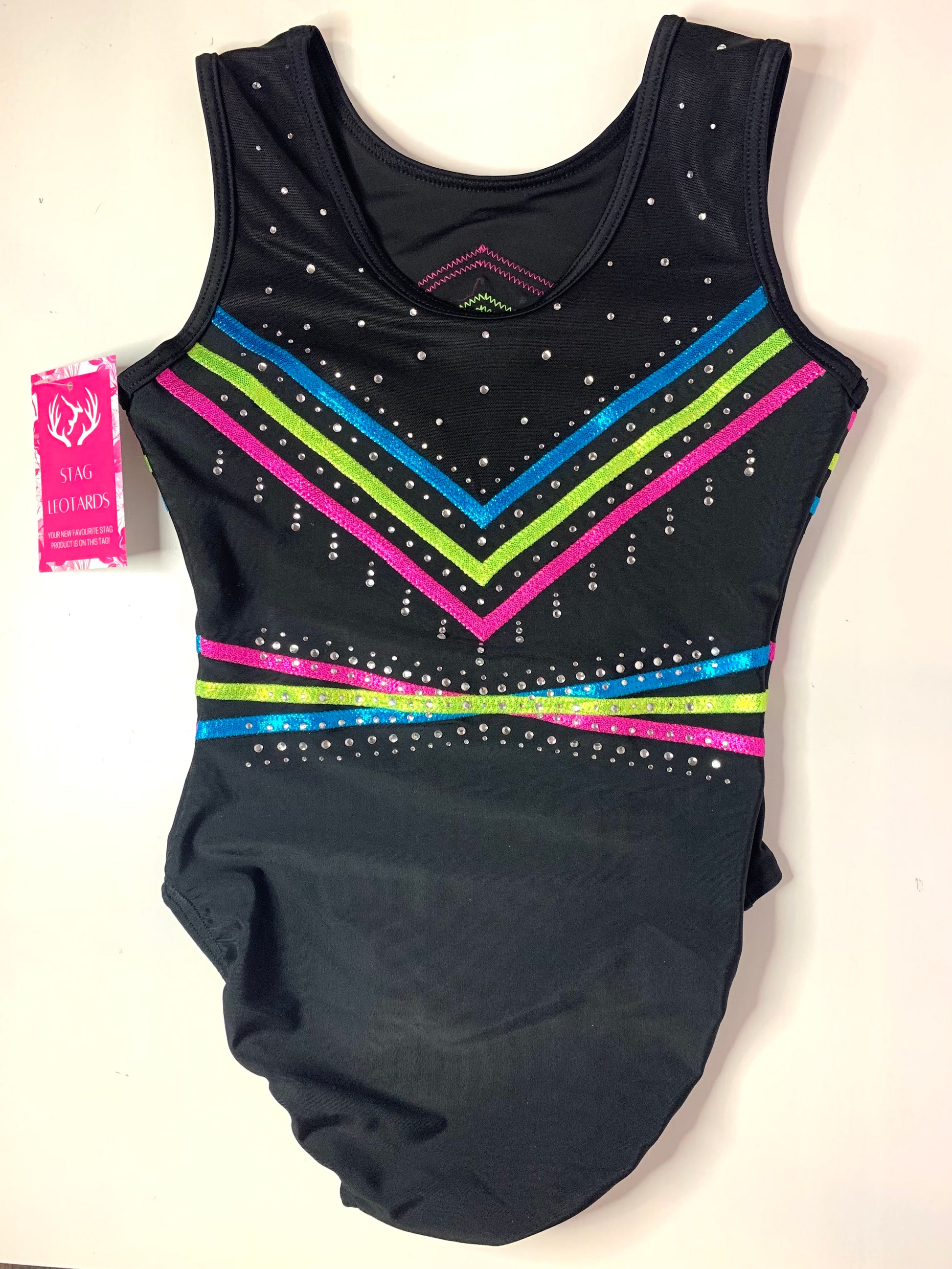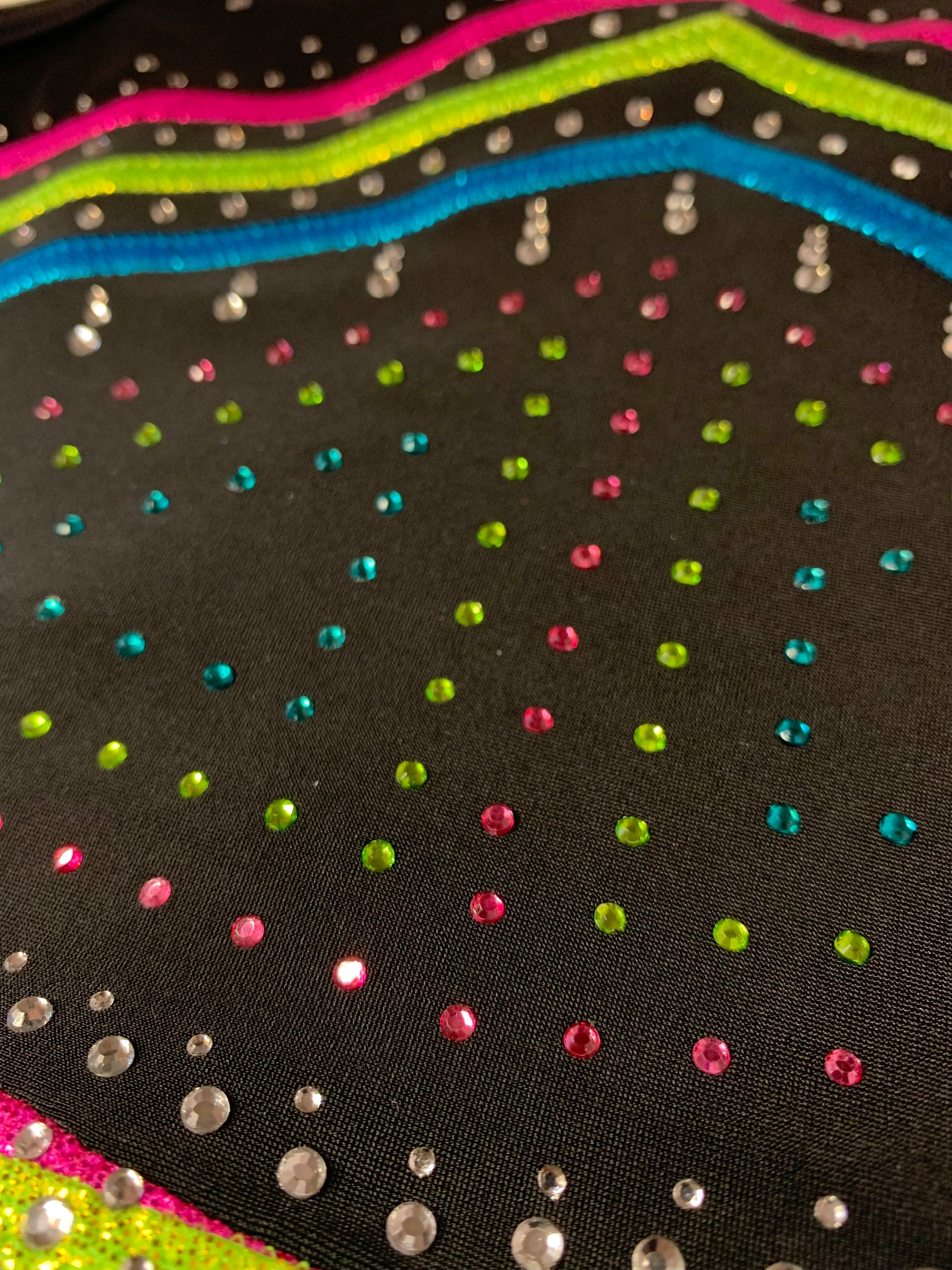 We love bright and contrasting leotards and so have designed our Kaleidoscope leotard to be just that! Featuring Pink, Ocean Blue and Lime Green Mystique appliques on a soft black Lycra bodice, this leotard combines both style and comfort.